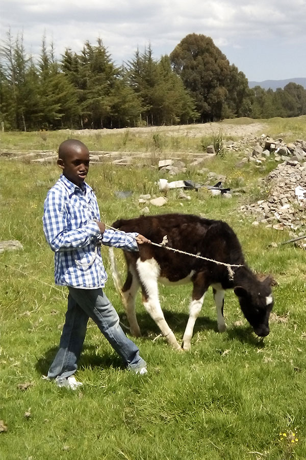 A student transfers to pasture land BSK's first young heifer that will soon supply the children with milk.
